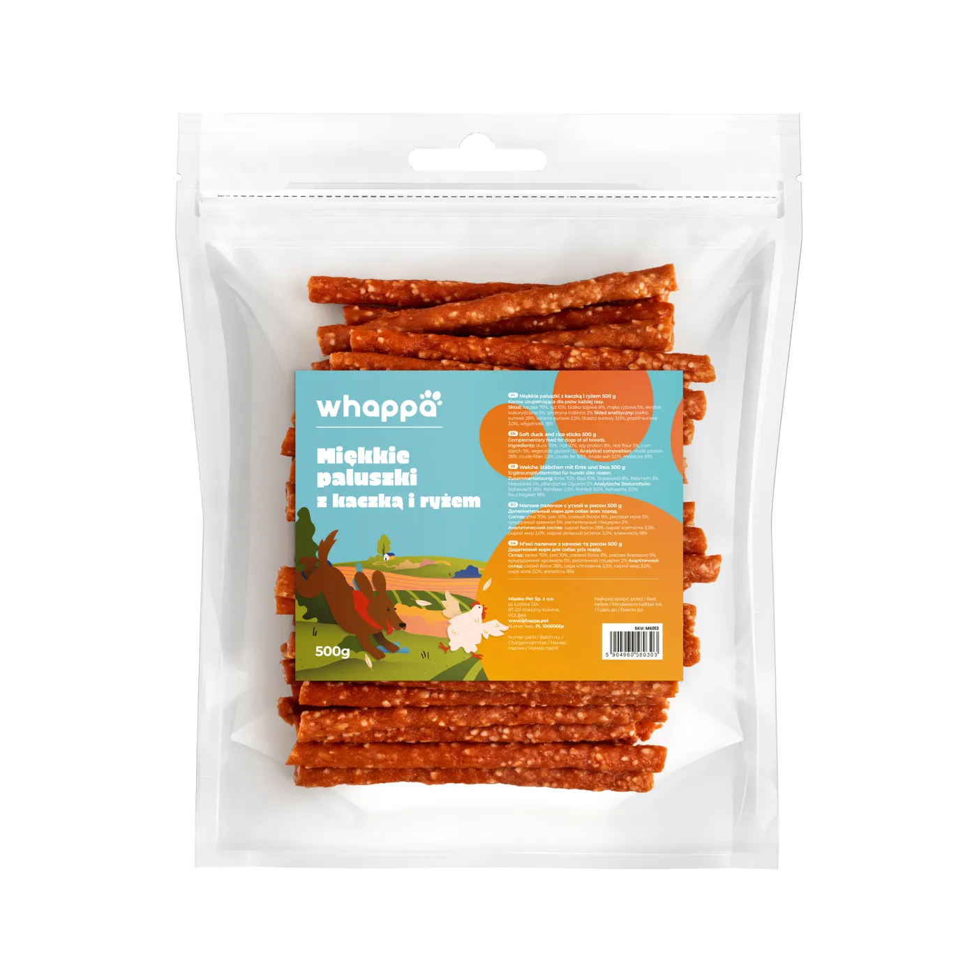 Skład: kaczka 70%, ryż 10%, białko sojowe