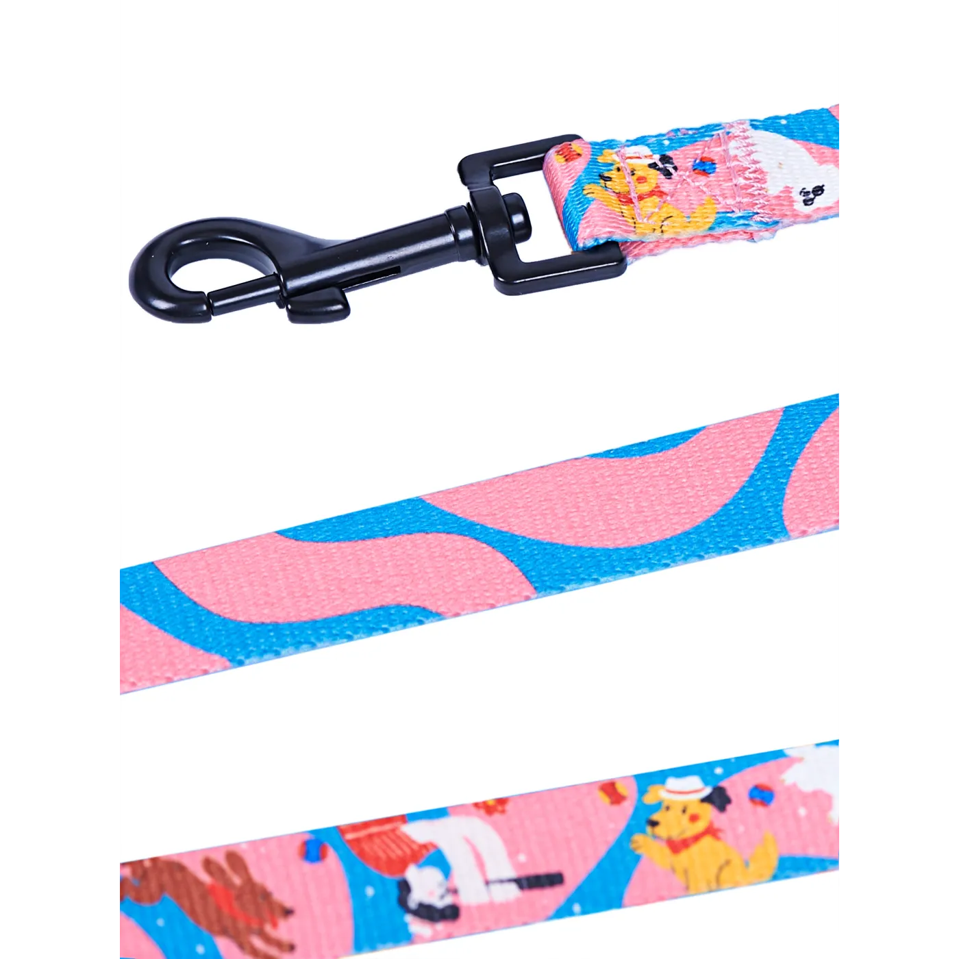 Smycz Whappa w 3 rozmiarach (S–L). Miękki uchwyt z neoprenu, trwałe materiały i ilustracyjny design inspirowany opakowaniami przysmaków. Pasuje do szelek, obroży, bandany i etui Whappa.