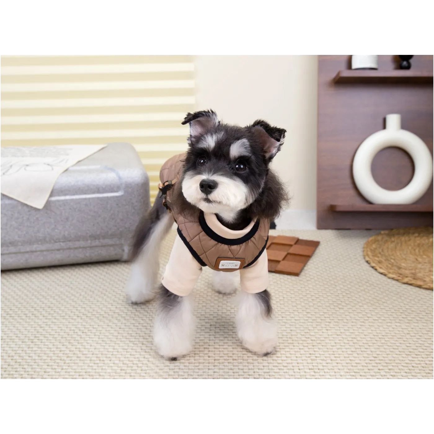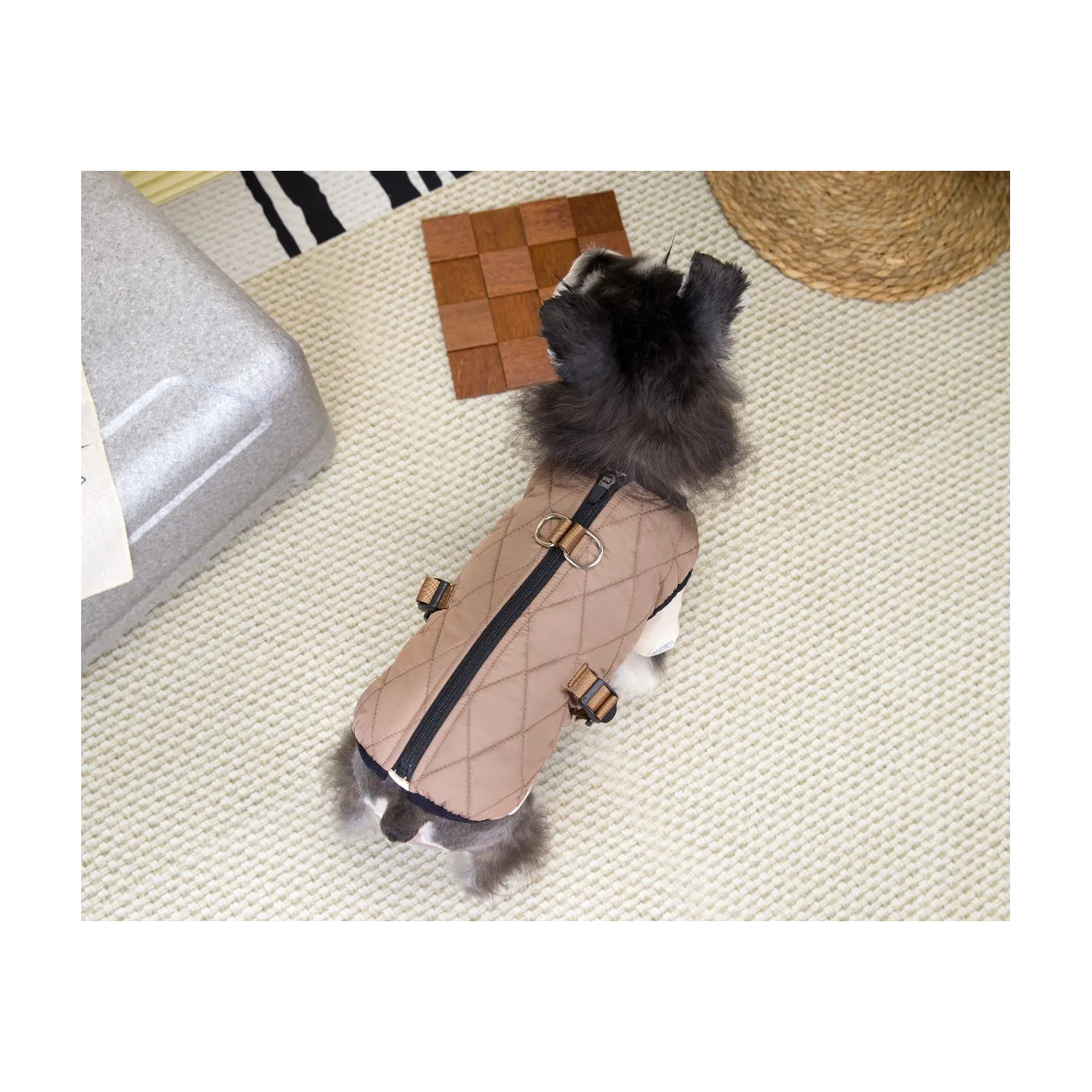 Wysoki golf chroni szyję pupila przed zimnem i wiatrem, a pikowana forma dodaje elegancji. Kamizelka dostępna jest w trzech wersjach kolorystycznych – brązowej, zielonej i bordowej – dzięki czemu każdy właściciel może dopasować styl do swojego psa.